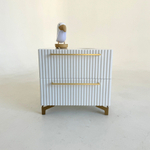 Прикроватная тумба от белорусского бренда SHTABE коллекции GROSS 6103. Модель изготавливается из ЛДСП и крашенного МДФ. Рельефный фасад с волнистой отделкой сделан методом 3D фрезеровки. Тумбочка доступна в двух вариантах: каркас в отделке дуб Веллингтон с фасадом графитового цвета или полностью в белом цвете. Ручки и ножки изготавливаются из металла в двух вариантах цвета: золотой и черный. В тумбе используются направляющие скрытого монтажа PUSH TO OPEN Hettich производство Германия.
